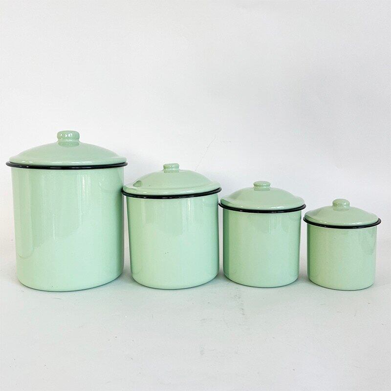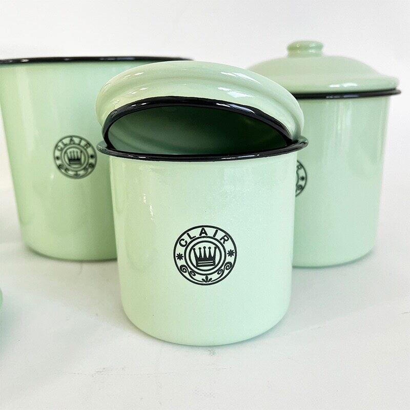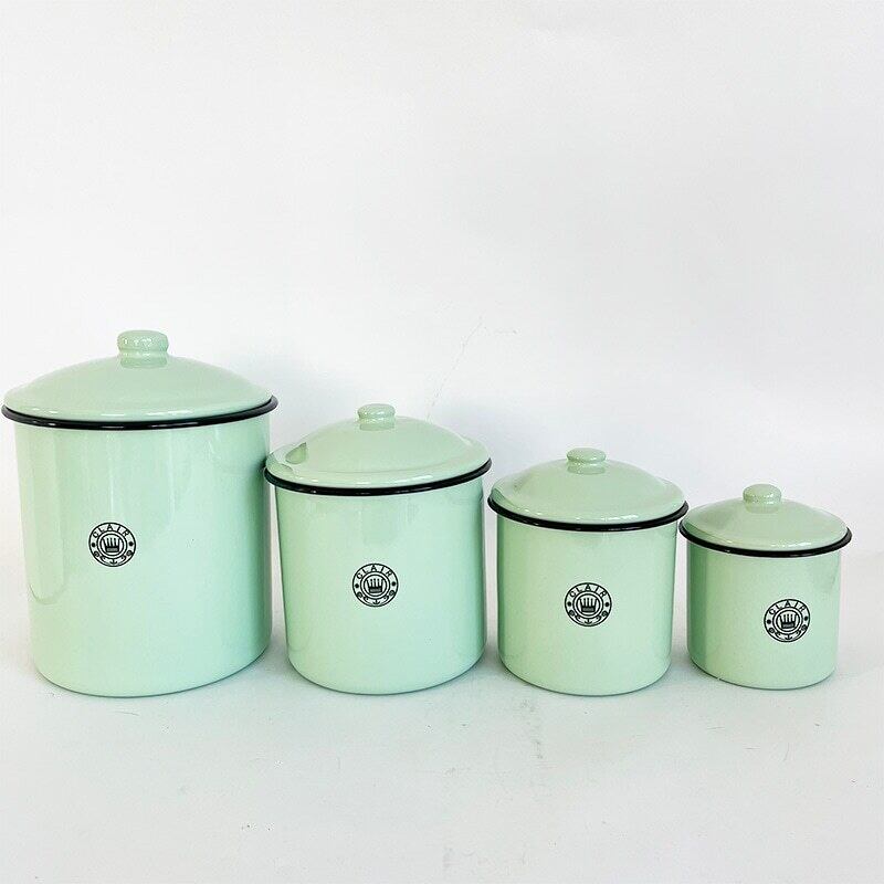 淡いグリーンのホーロー素材がキッチンを爽やかに彩るキャニスター。