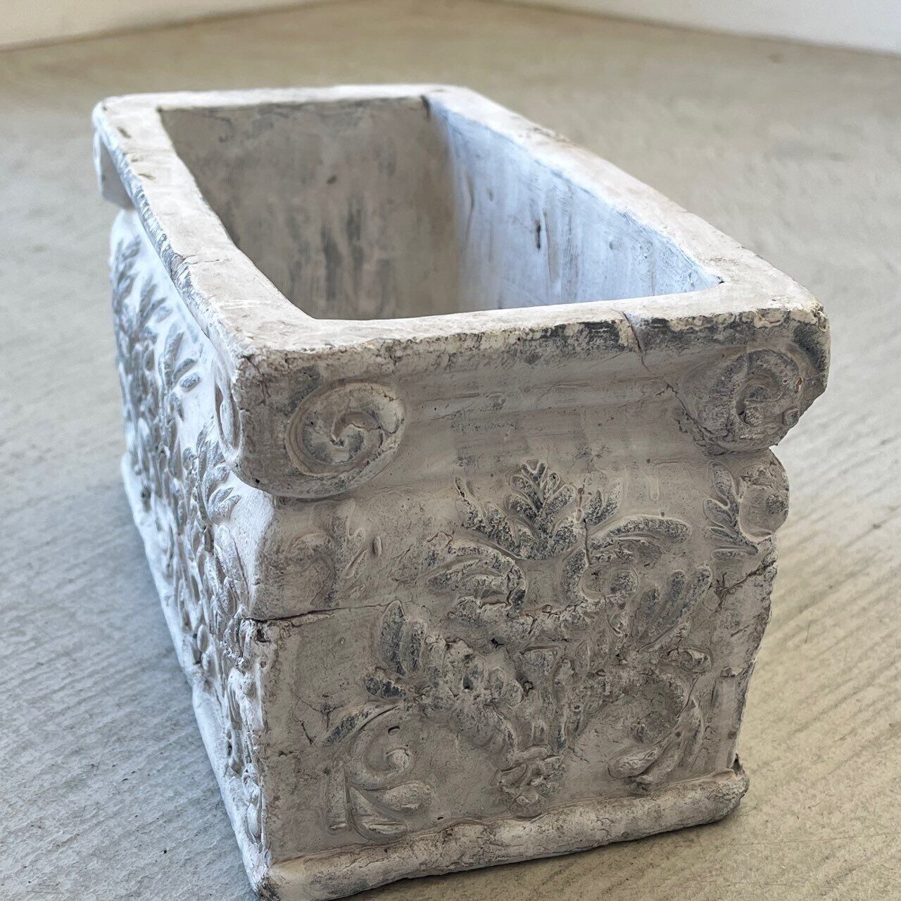 花々のレリーフが可憐な印象を与える、スクエア型のポット。